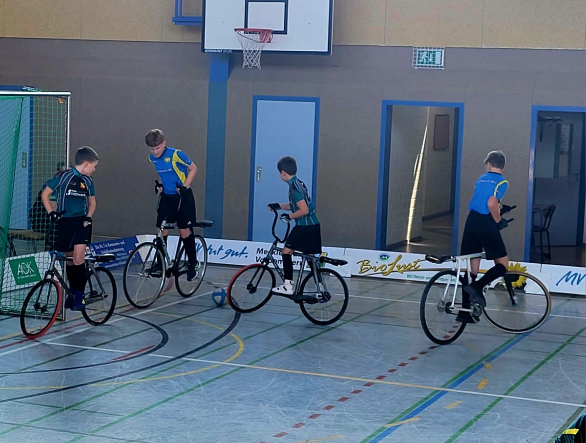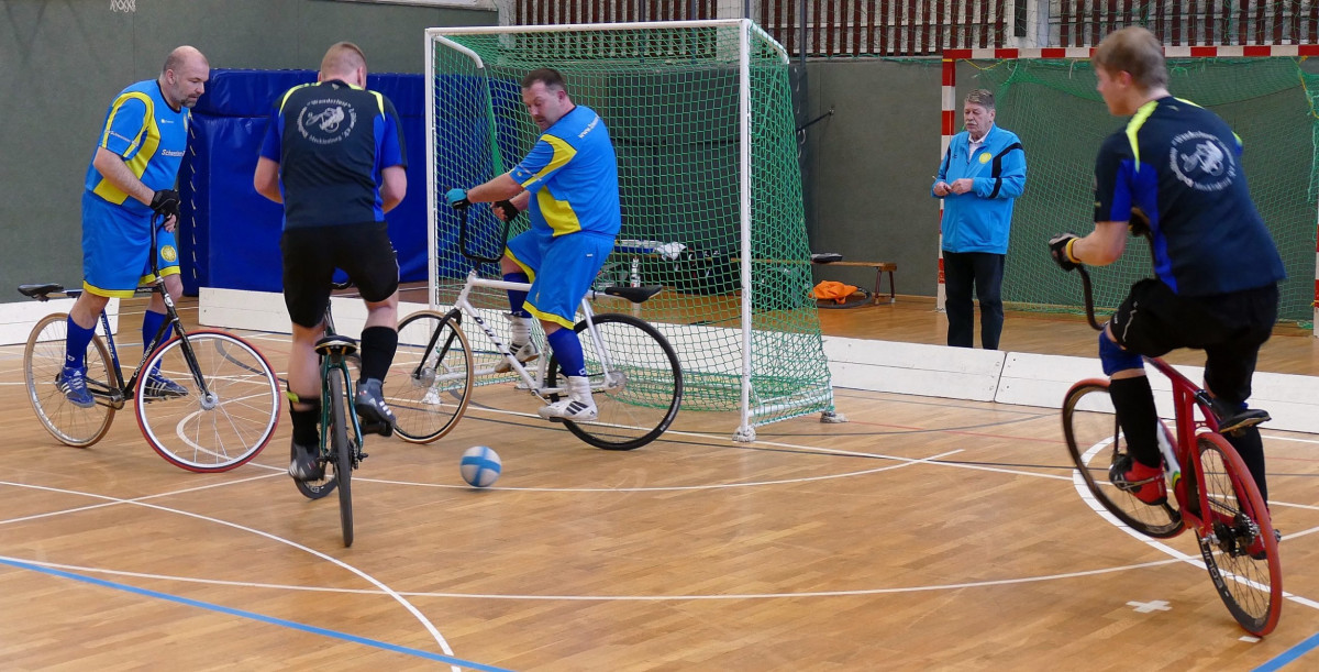 Zwei Teams versuchen, den Ball mithilfe eines Radballrades möglichst oft im Tor des Gegners unterzubringen.